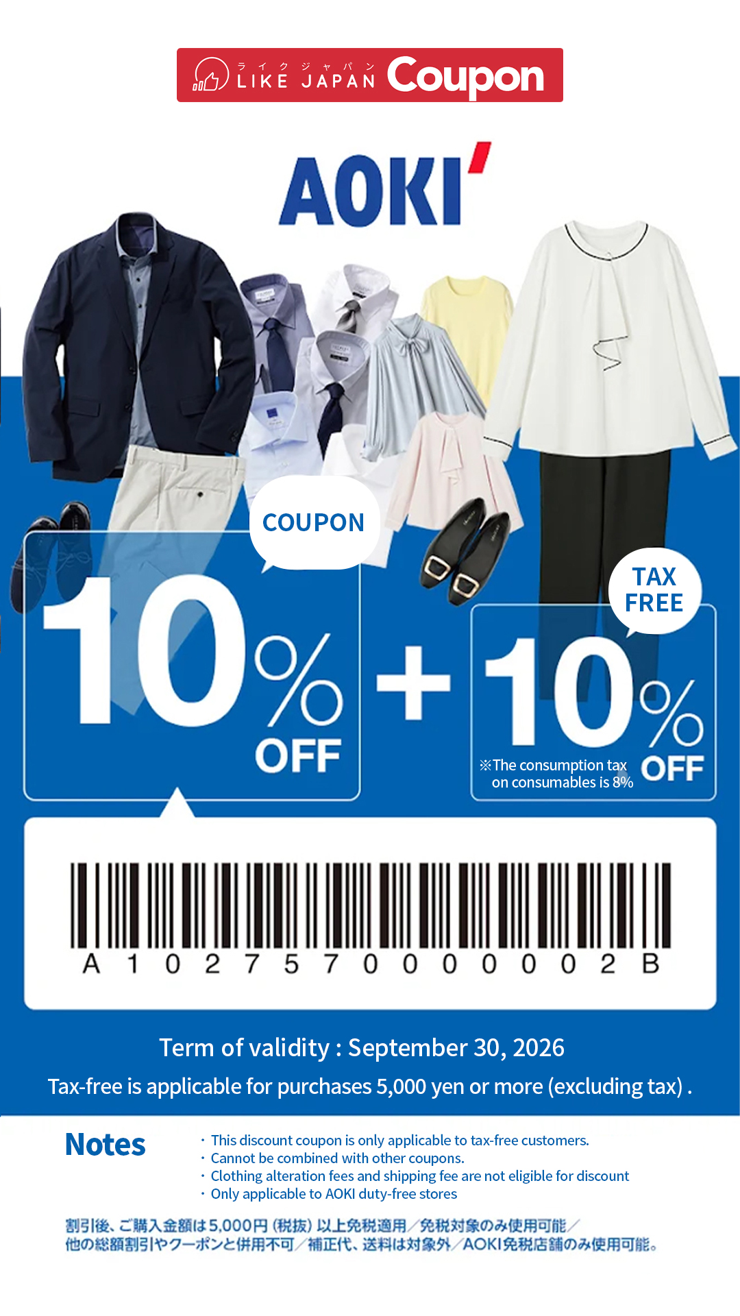 AOKI Japanese Suit company: Tax Free 10%+10%OFF