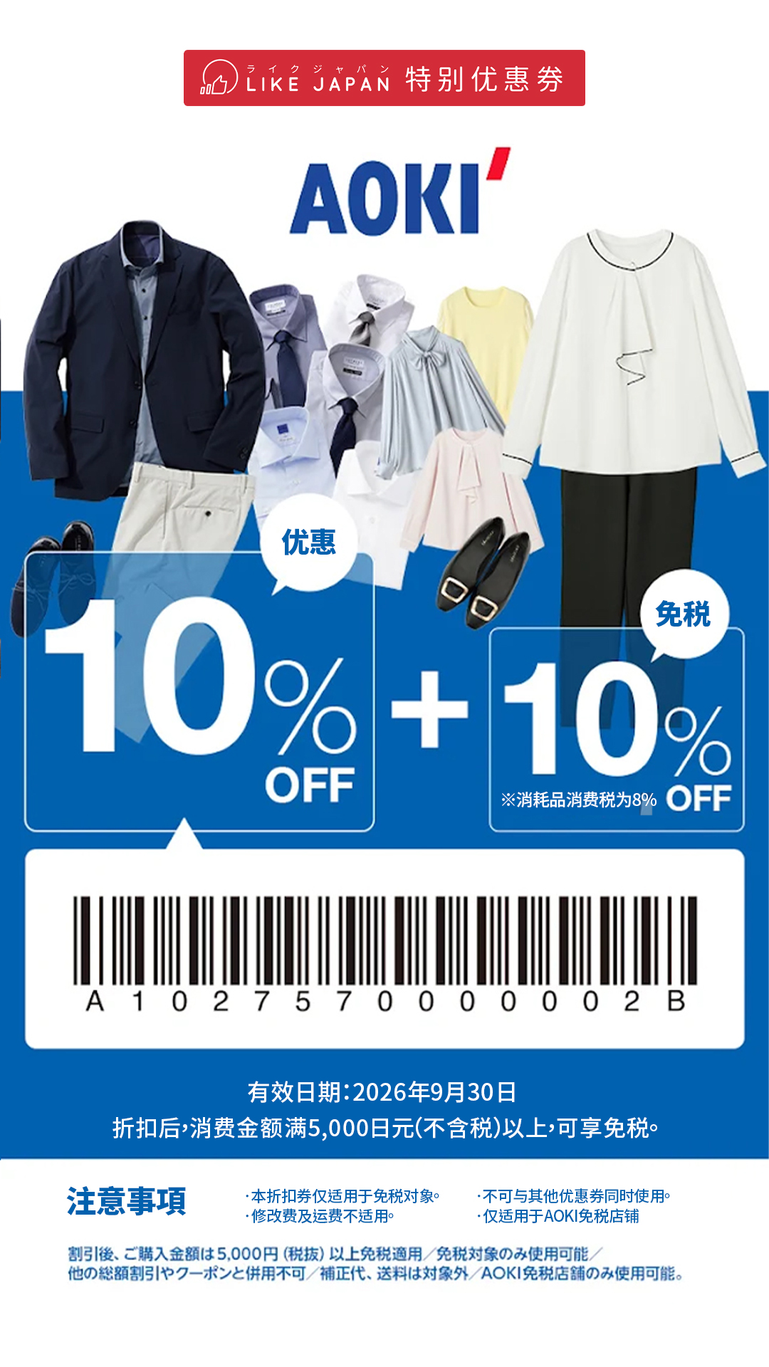 AOKI青木西服优惠券 免税10% + 10%OFF