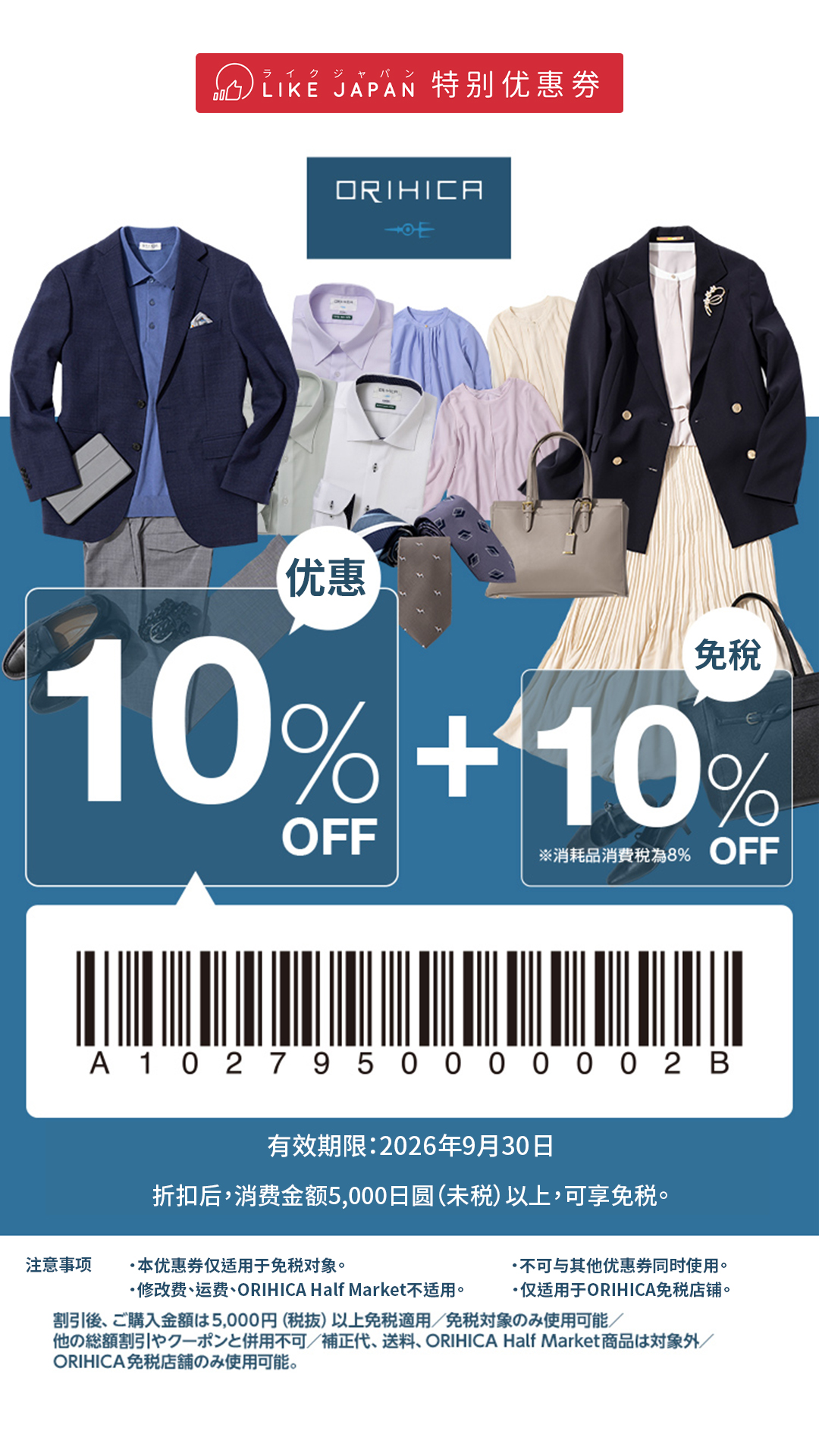 ORIHICA优惠券 免税10% + 10% OFF