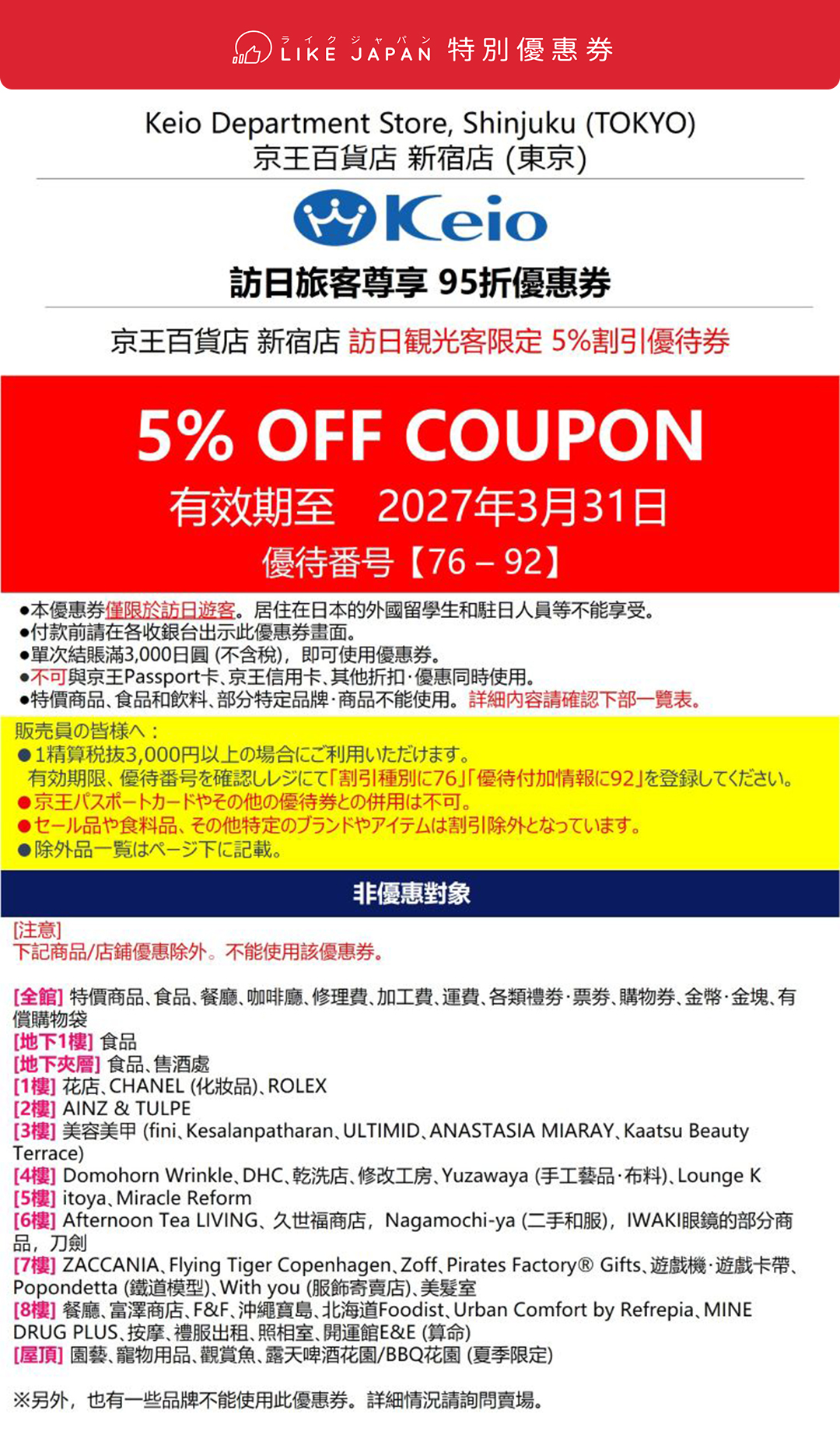 - 於京王百貨店新宿店單筆消費(不含稅)滿 3,000 日圓,即可享 5% 折扣優惠;