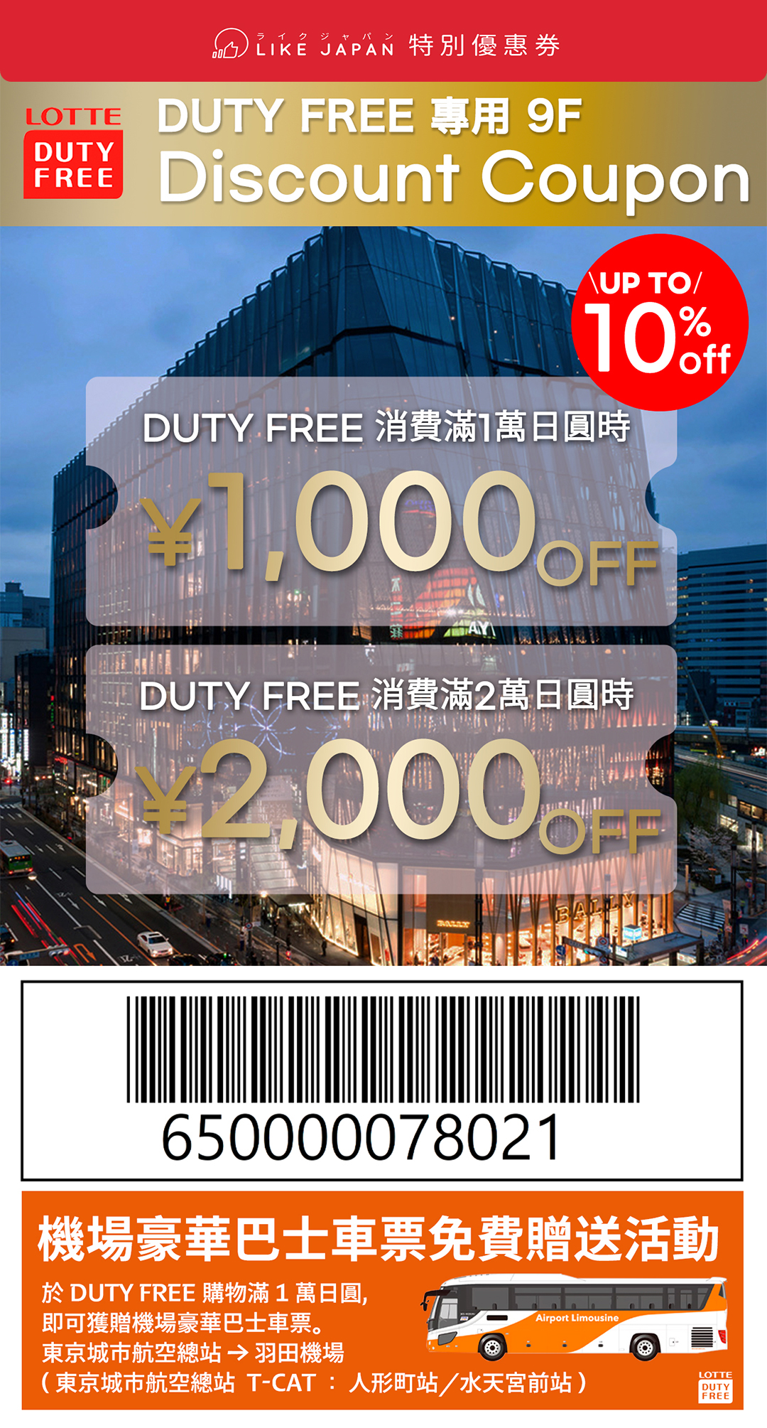 於 DUTY FREE 消費滿 10,000 日圓,即可免費獲贈「機場豪華巴士(Airport Limousine)」車票一張*。