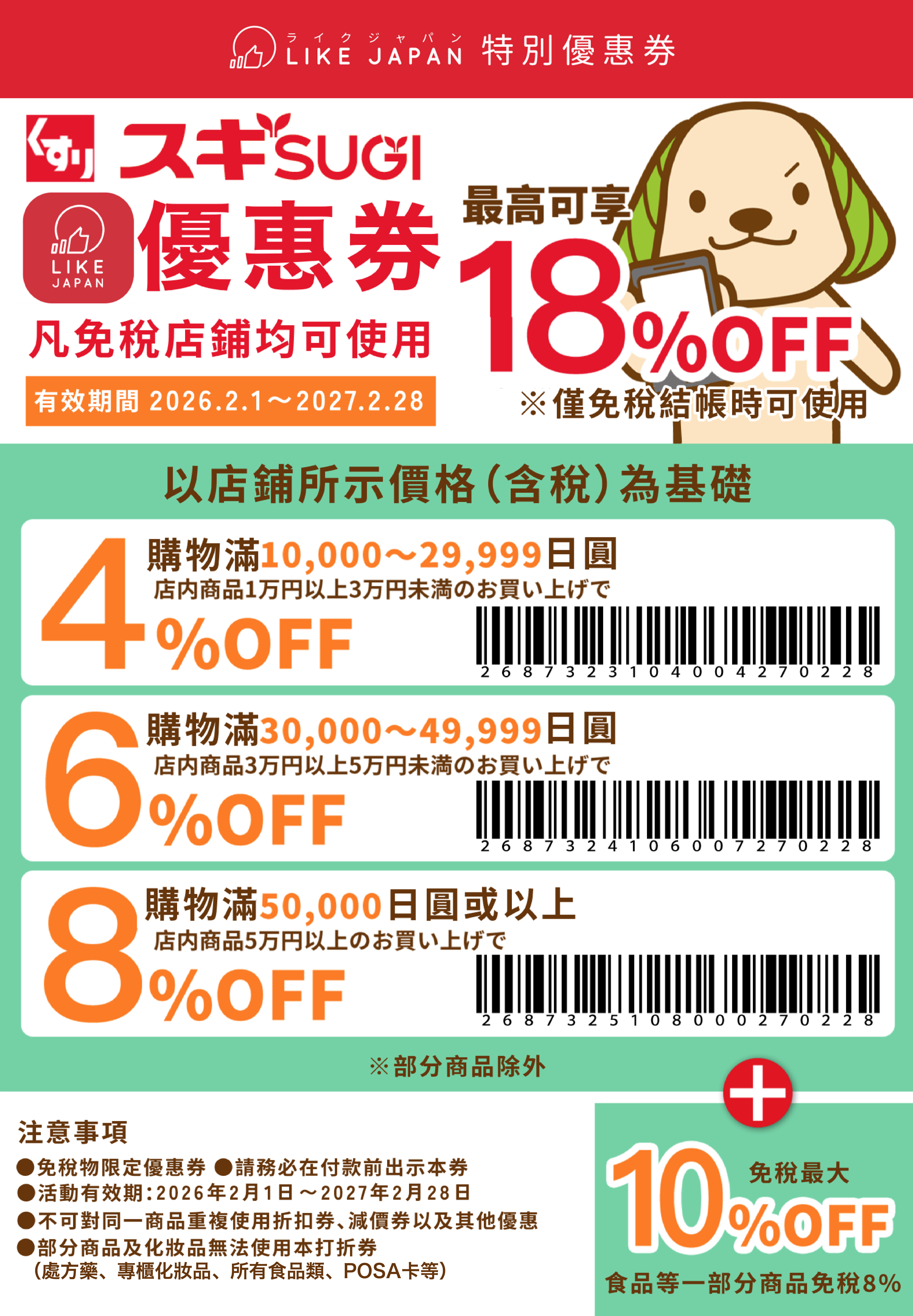 自即日至2027年2月28日,於全日本免稅對應的杉藥局門市均可使用此優惠券,最高可享 18% OFF!結帳時出示即可享受折扣,非常適合旅日購物的外國旅客。
