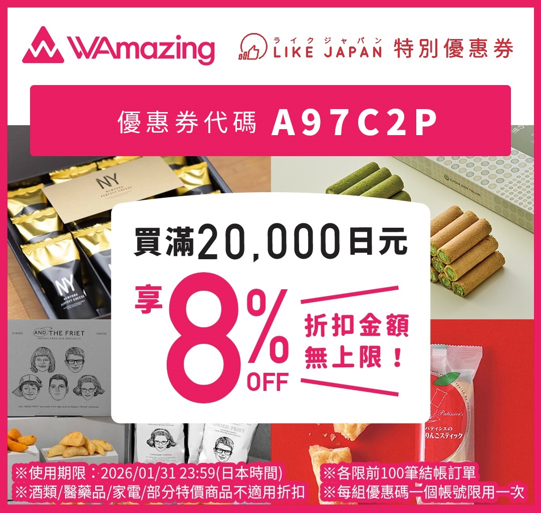※使用期限:2026/01/31 23:59(日本時間) (購物連結按此)(名額 100名) - 優惠2:使用完美行購物優惠碼7F6A2M,買滿20,000日圓享3%OFF (購物連結按此)(名額 100名)(最大折扣金額:10,000日元)※使用期限:2026/03/31 23:59(日本時間)